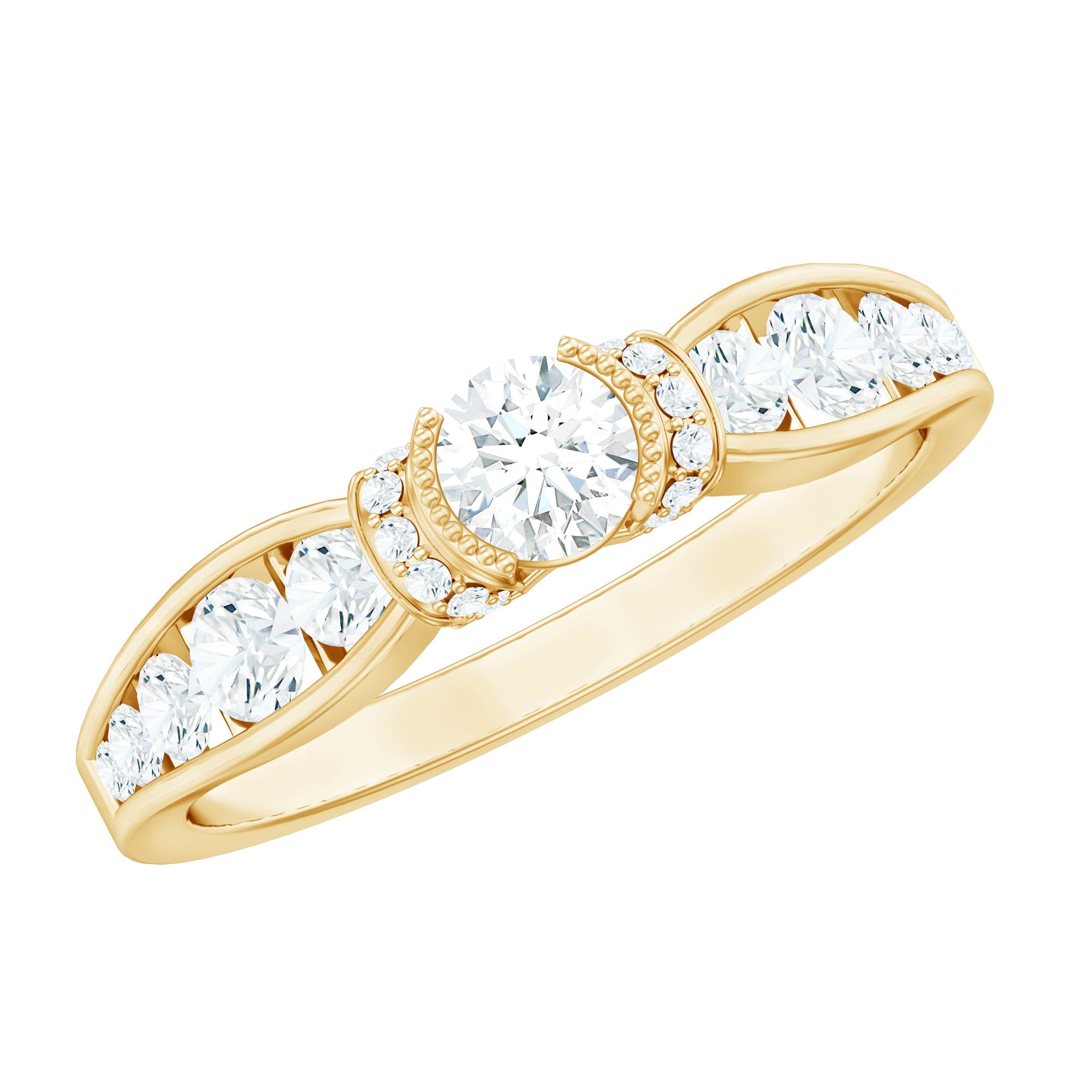 Embrace timeless beauty with this Vintage Moissanite Engagement Ring - an elegant blend of old-world charm and modern brilliance. At the center of the design lies a 4 MM round moissanite, securely nestled in a safe half bezel setting. The centerpiece is framed by a graceful collar design, accented with dainty graduated style side stones that enhance the ring’s brilliance without overpowering its refined silhouette. Beaded detailing adds a touch of antique artistry, giving the ring a romantic, heirloom-inspired feel. Every element is thoughtfully crafted to evoke a sense of nostalgia while still feeling fresh and contemporary. Perfect for the bride who appreciates classic elegance with a unique twist, this Antique Looking Engagement Ring is more than just jewelry - it is a meaningful symbol of love, commitment, and individuality. Whether you are proposing, celebrating an anniversary, or gifting a lasting memory, this Moissanite Ring for Women makes a beautiful and intentional statement. With vintage details, modern sparkle, and a story woven into every curve, this Vintage Moissanite Ring is designed to be treasured forever - a timeless piece for a love that never goes out of style.