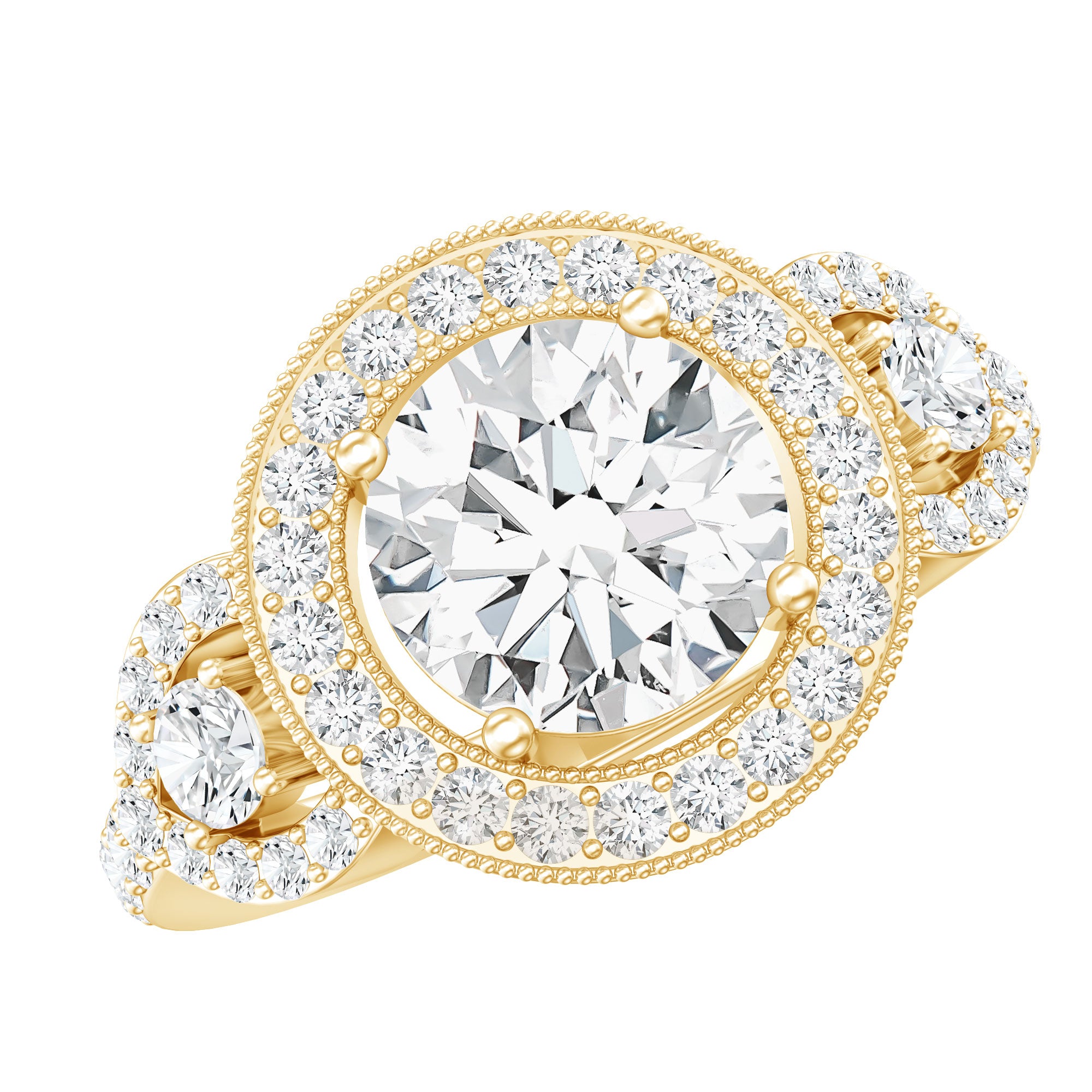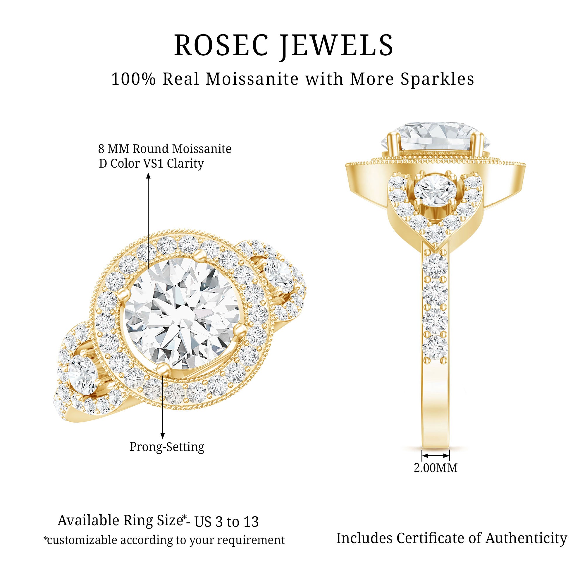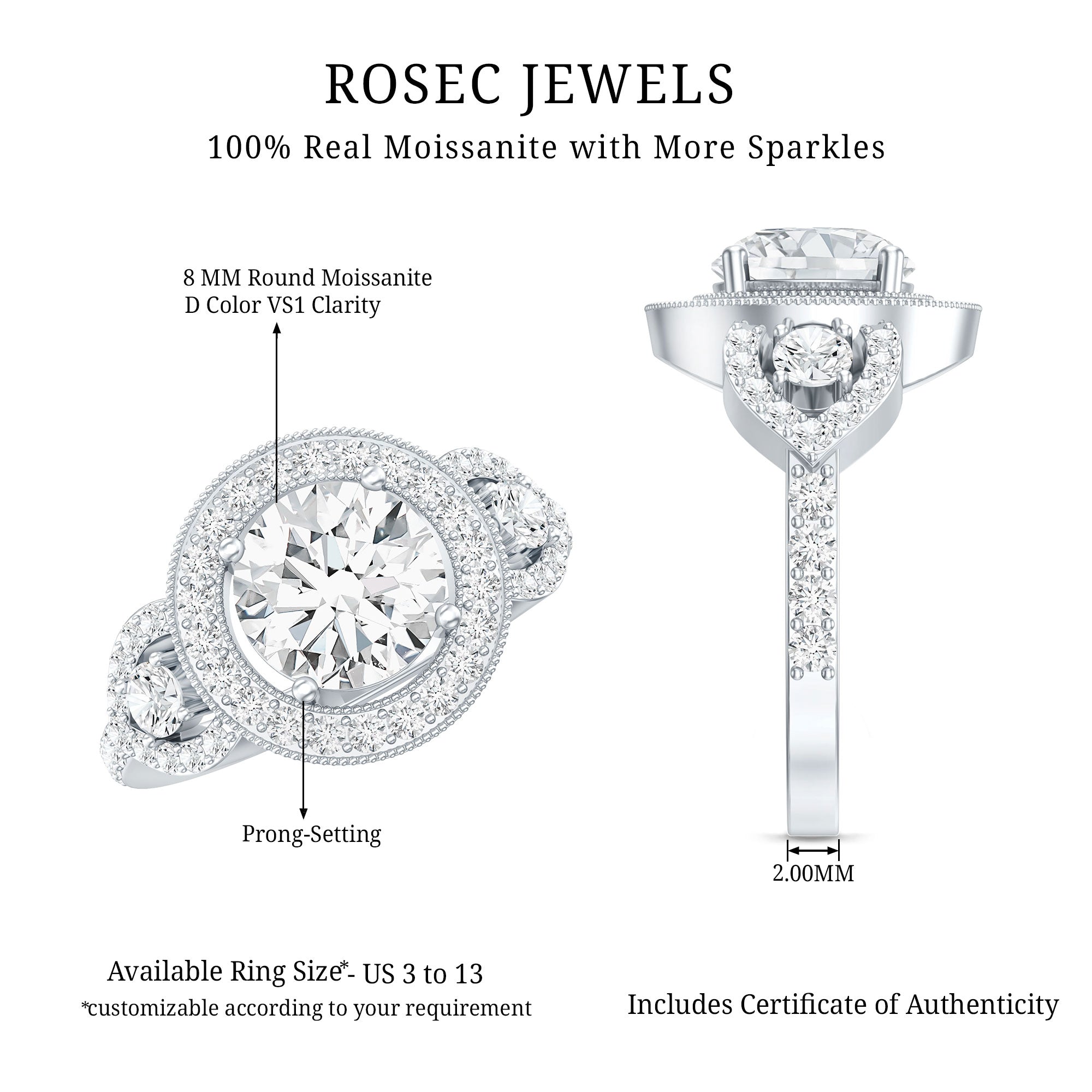 Make her fall in love again with this Moissanite Engagement Ring. It is embedded with an 8 MM Round Shape Moissanite securely placed in Prong Setting encircled with a Halo of smaller moissanite. The center stone is adorned with Milgrain Embellishment and small Moissanite gemstones are placed on both sides. This Vintage Engagement Ring captures a hint of romance and elegance making it perfect for the celebration of love. This Halo Engagement Ring reflects the adorable shine of D-VS1 Quality Moissanite that will instantly capture her heart. This Statement Ring is crafted for your special day and will be delivered in a signature jewelry box.