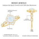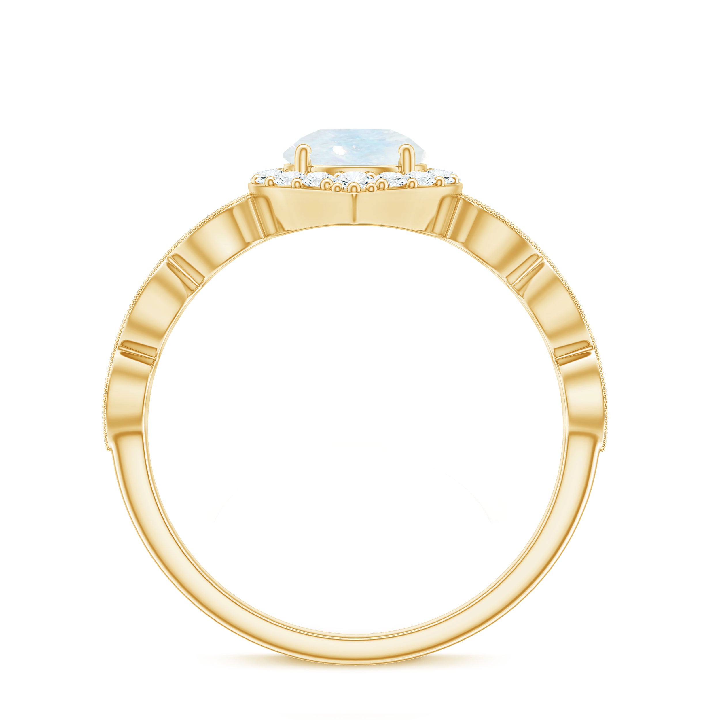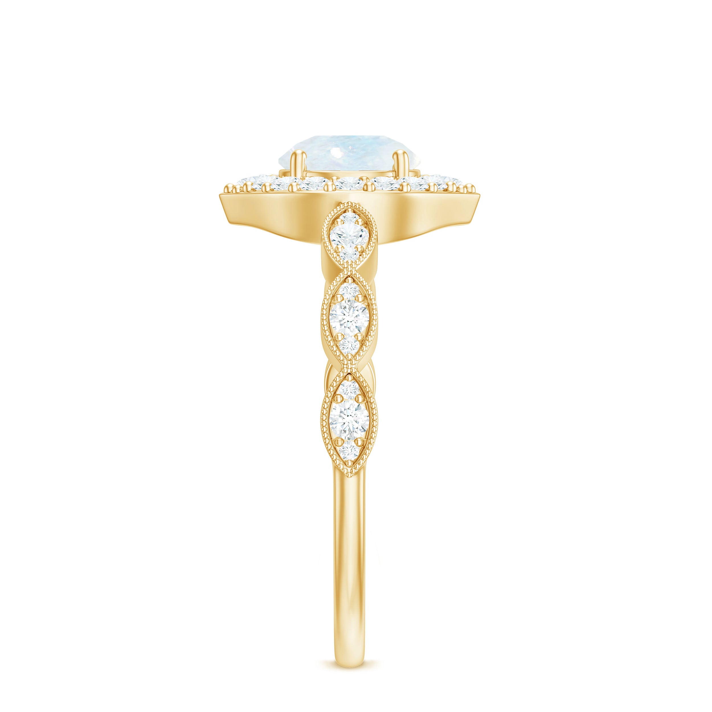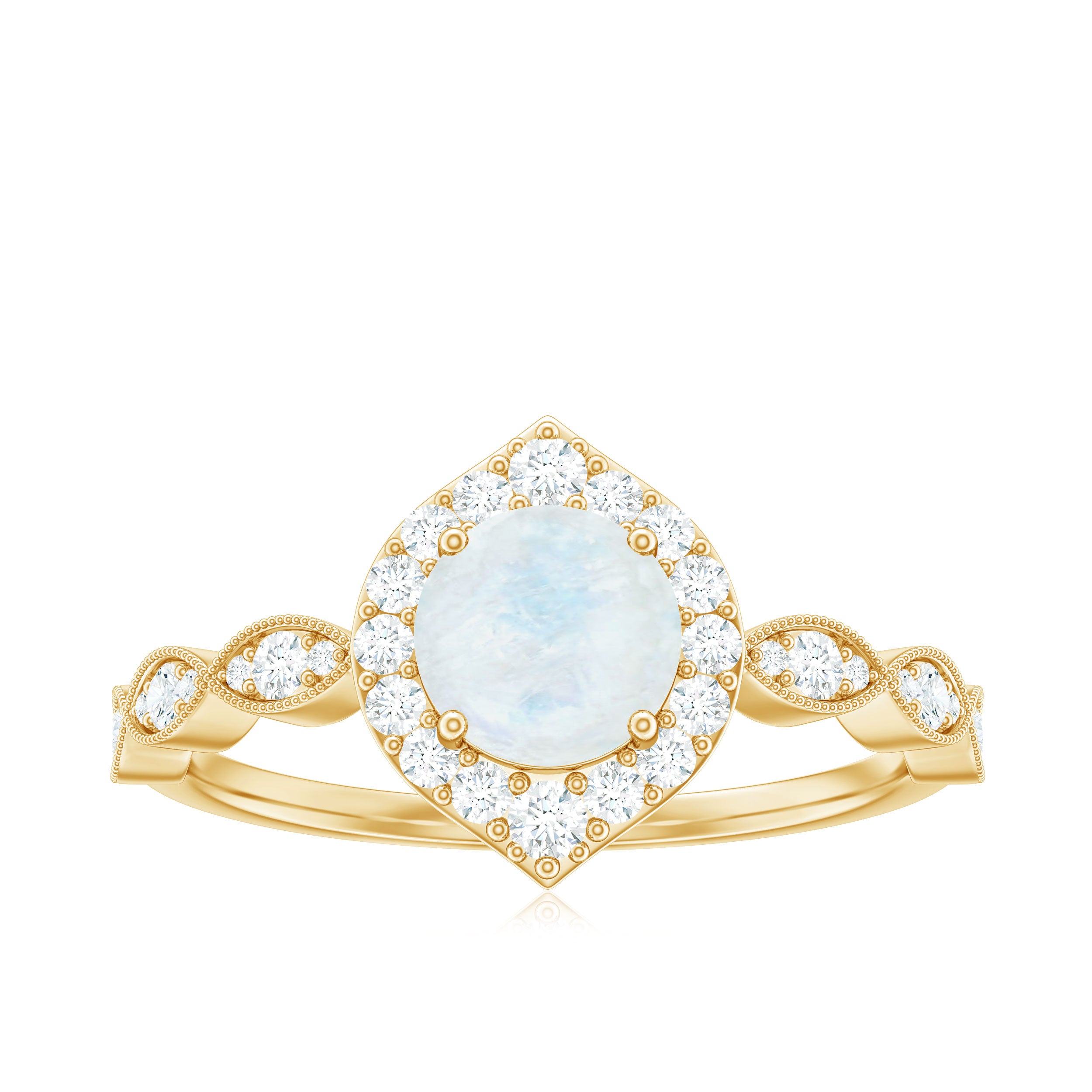 Indulge in regal elegance with this vintage-style engagement ring, showcasing a dazzling 6 MM round-cut Moonstone at its center, encircled by round-cut Diamond accent on delicate beaded embellishments. Made of gold, this ring is an ideal choice for women who admire antique and artistic jewelry.