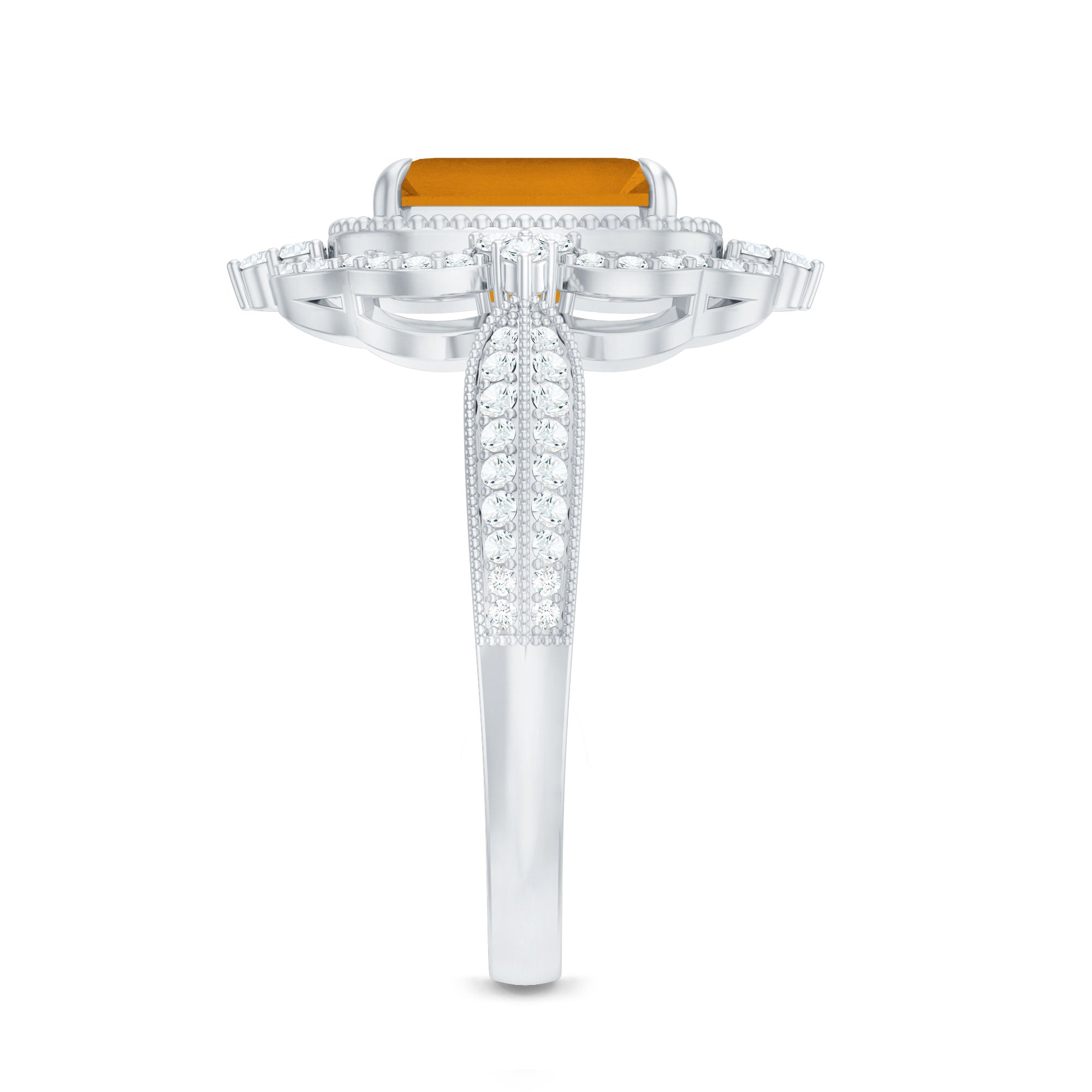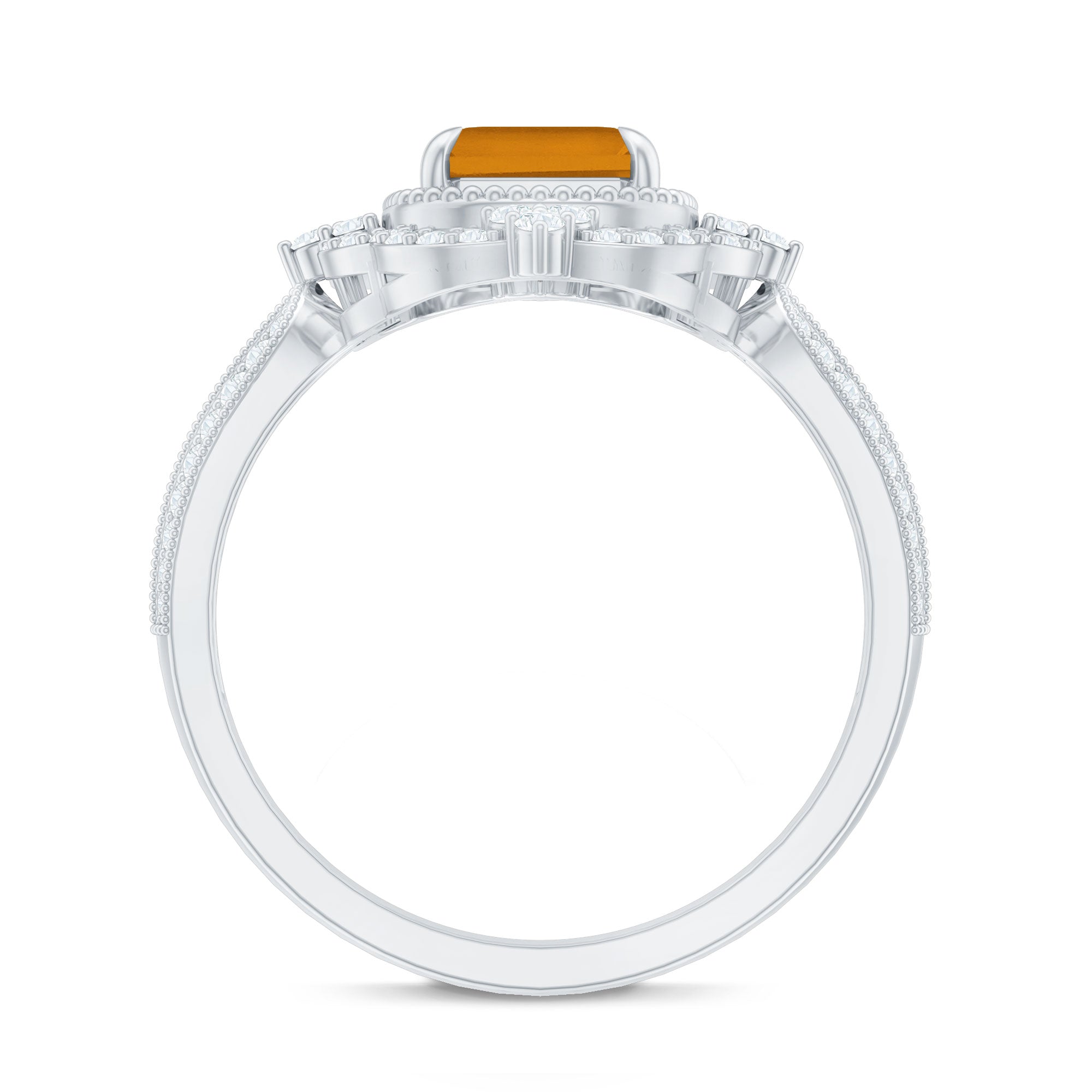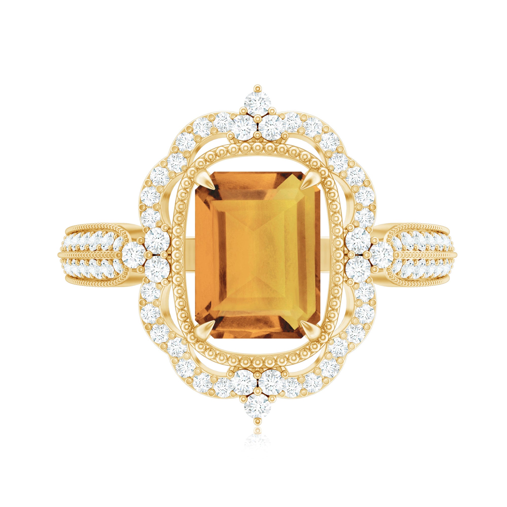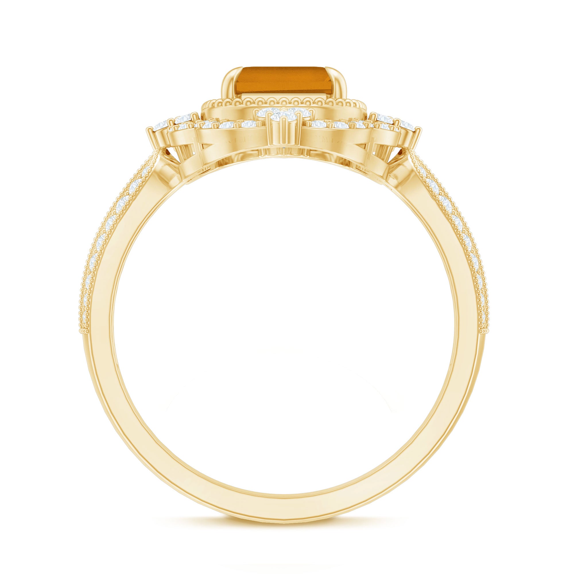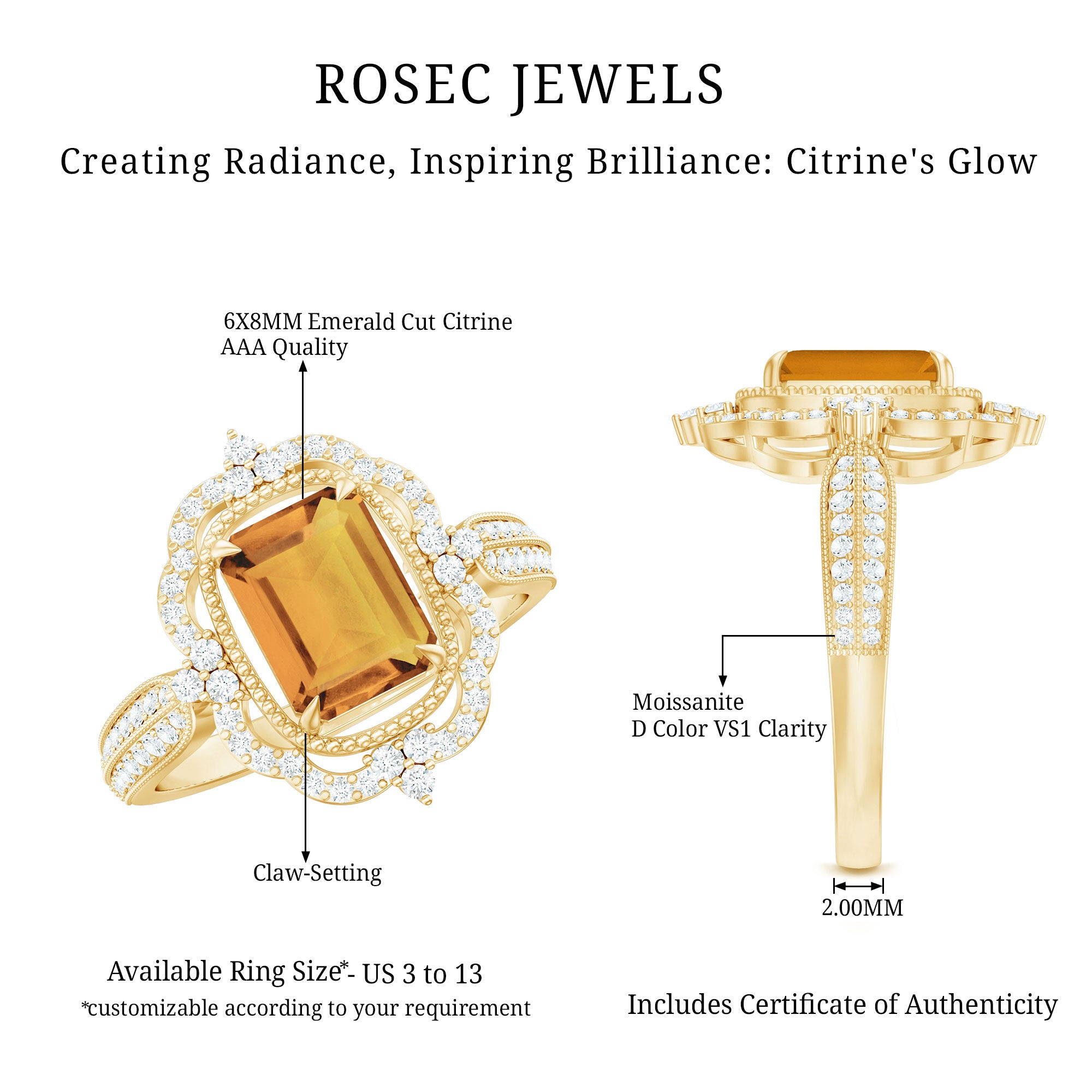 Add a touch of luxury and aesthetics to your style with this Citrine Vintage Ring. Octagon Cut Citrine is held in Claw Setting beautifully and to add more charm to its beauty, there are round moissanite stones studded in a prong setting. This Citrine Engagement Ring exhibit high brilliance.