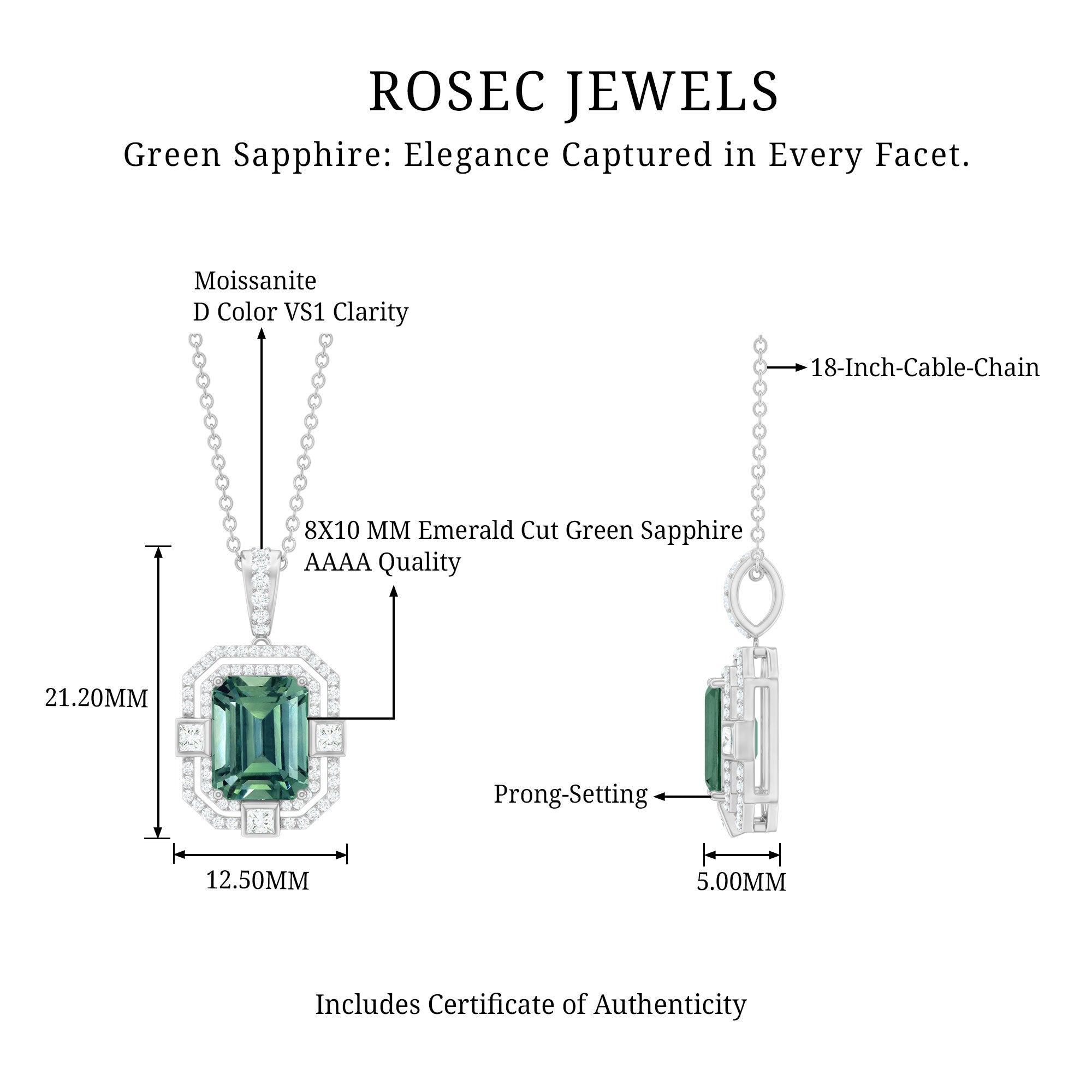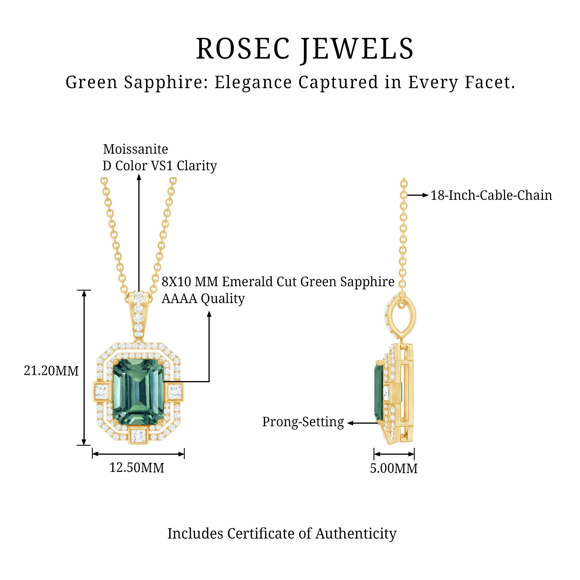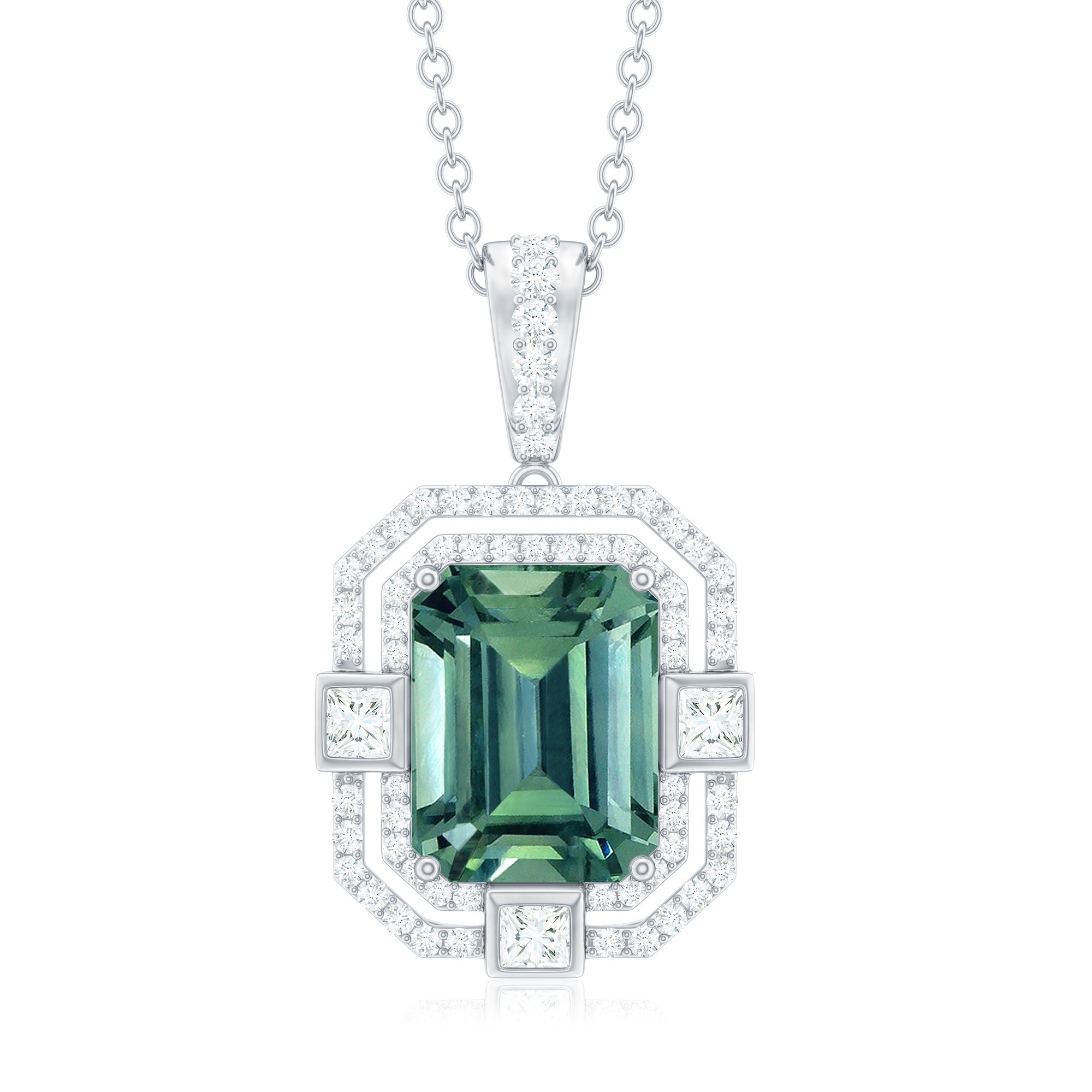 Emanating timeless charm, the Vintage-Inspired Pendant Necklace showcases a magnificent Octagon Shape Lab-Created Green Sapphire as its brilliant solitaire. Further enhanced by a captivating halo of Princess Cut and Round Cut Moissanite stones, exuding dazzling brilliance. With its stunning design, this necklace becomes a true expression of beauty, effortlessly elevating any look and leaving a lasting impression on all who behold it.