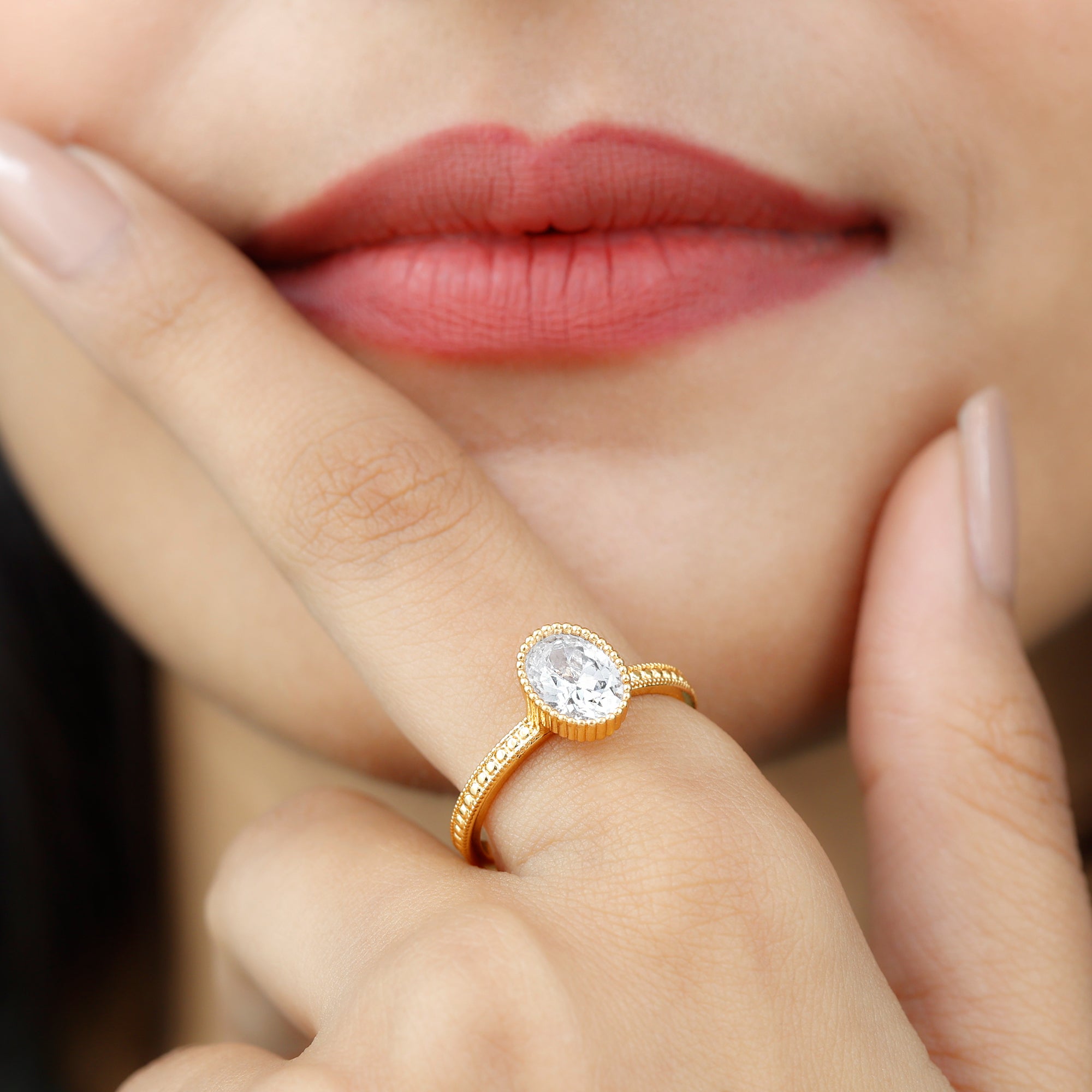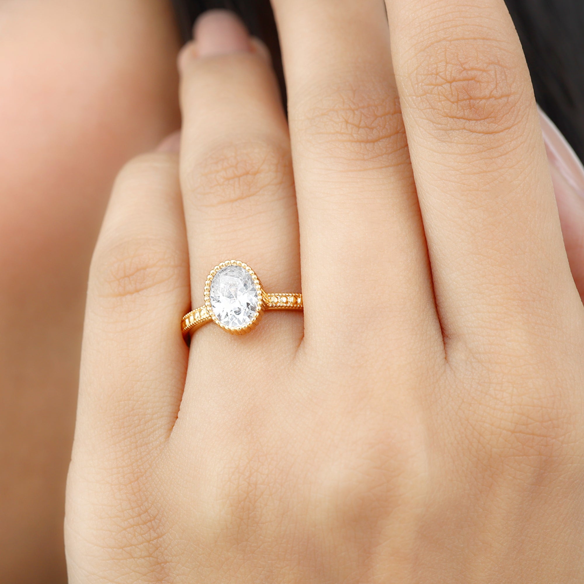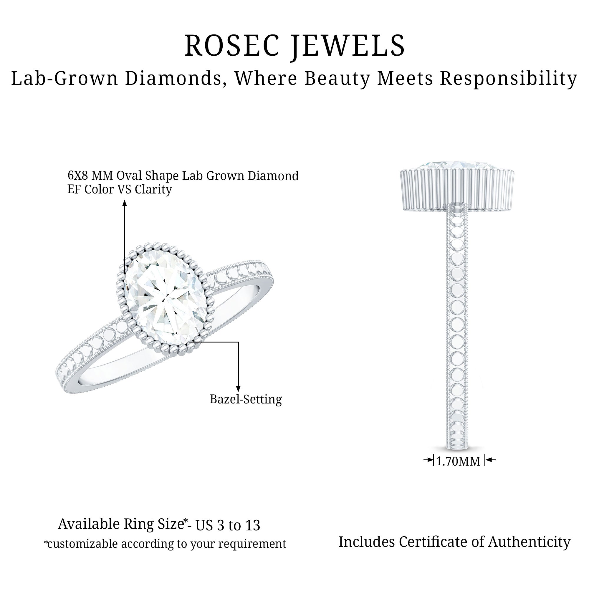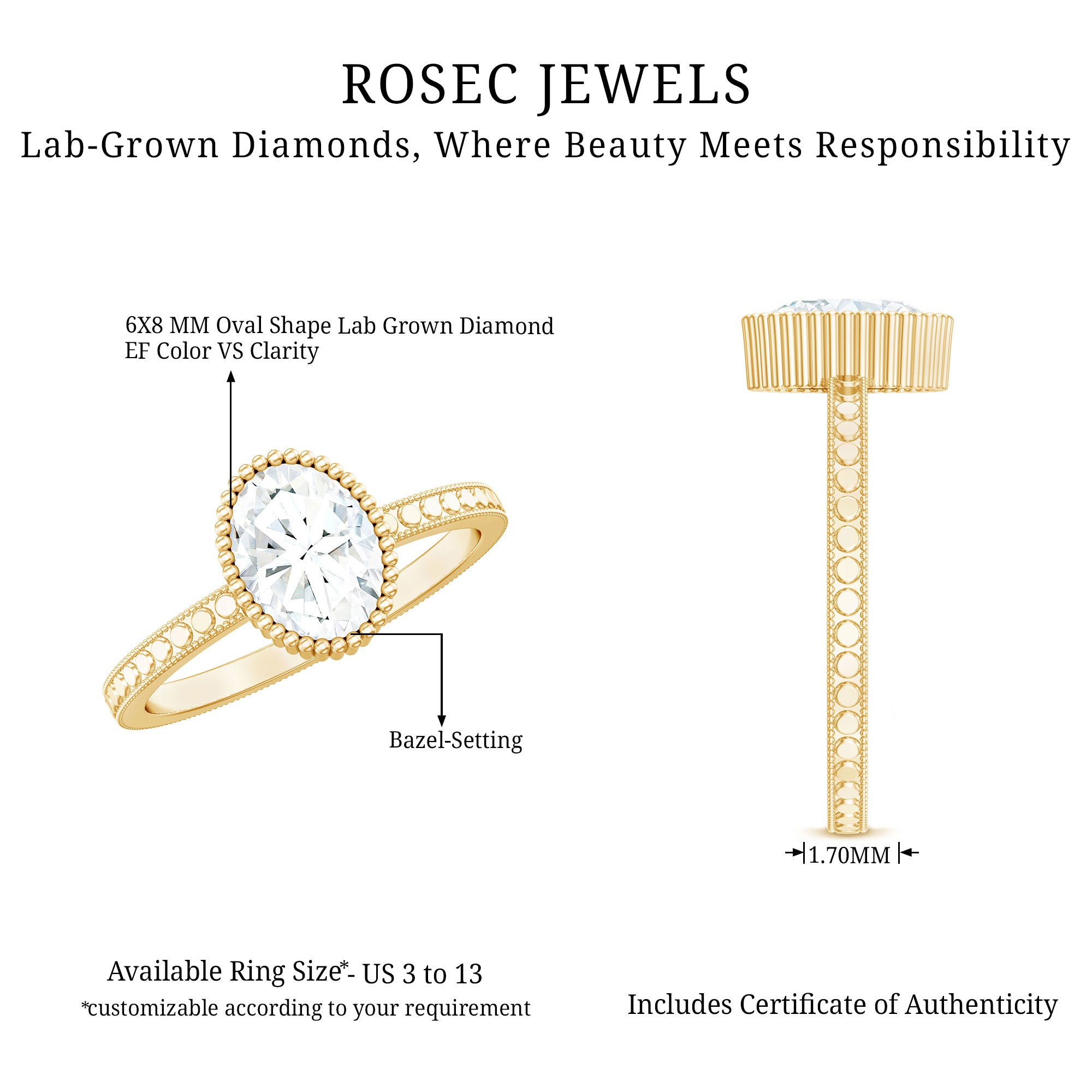 Behold this captivating Vintage Engagement Ring, featuring a brilliant Oval Shape Lab Grown Diamond delicately cradled within a bezel setting. The shank is exquisitely adorned with intricate beaded details, elevating its overall allure. This Solitaire Ring not only brings a touch of radiant elegance to your special occasion but also stands as a flawless choice for a proposal ring. Its timeless design and the dazzling Lab Grown Diamond make it a symbol of eternal love, promising a lifetime of shared moments and cherished memories.