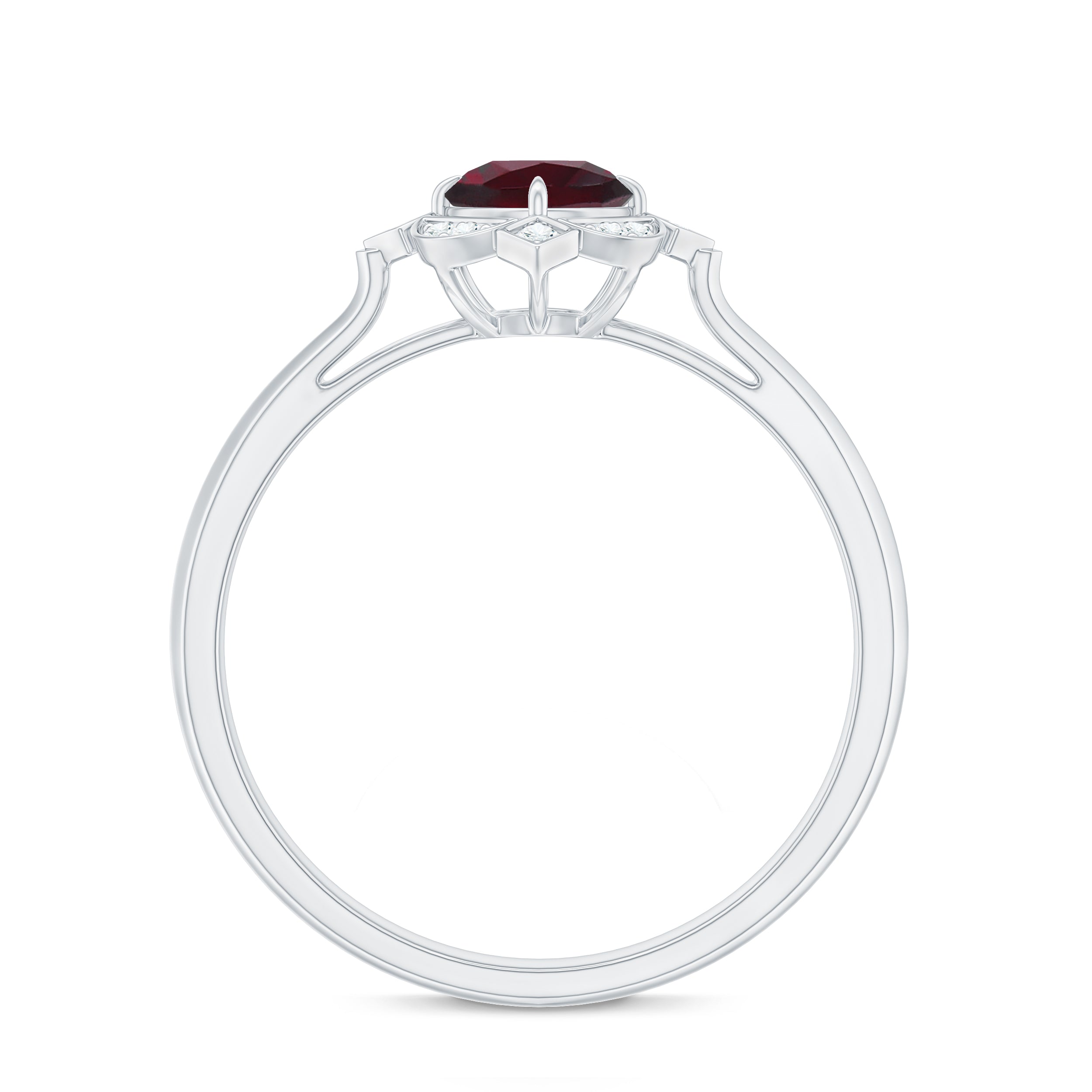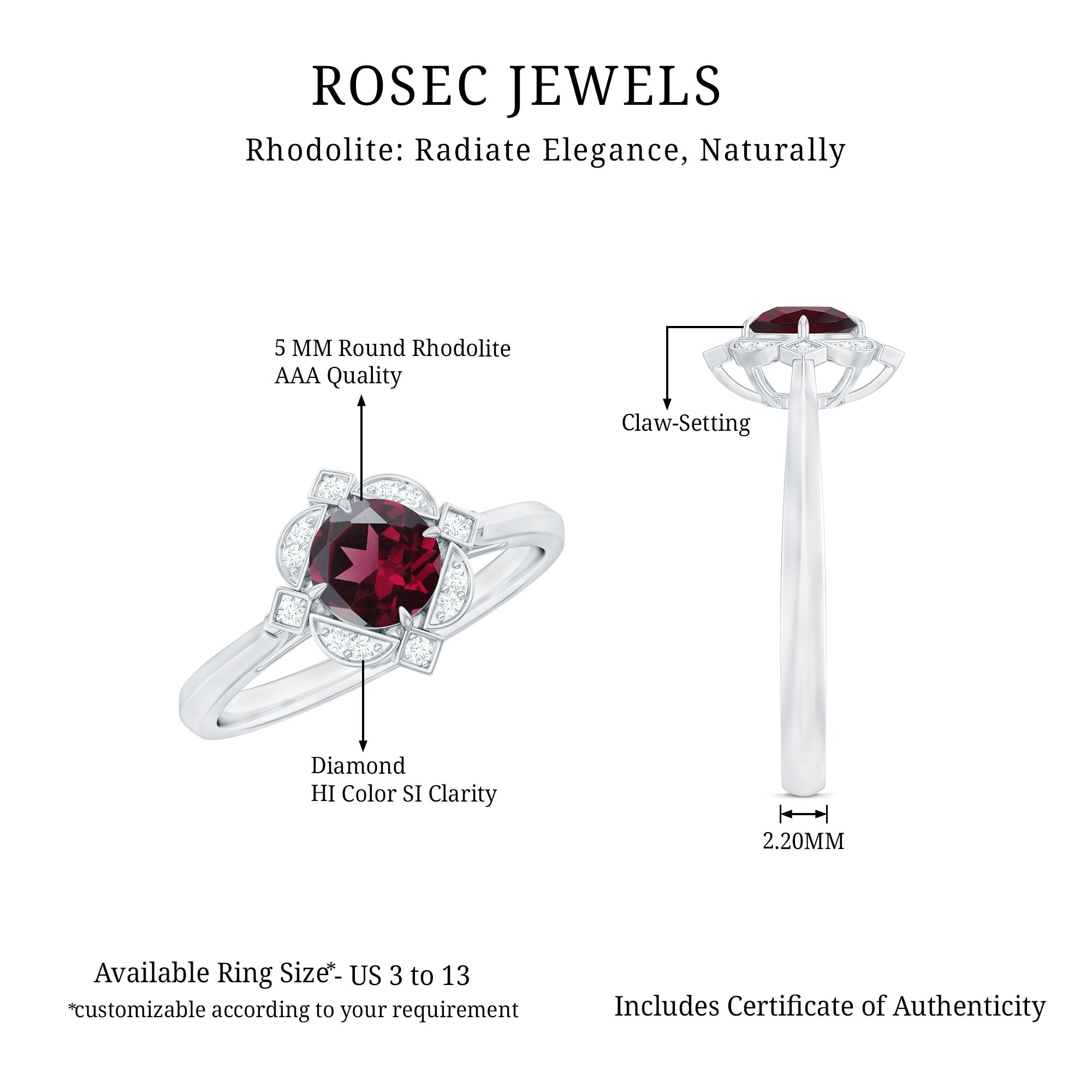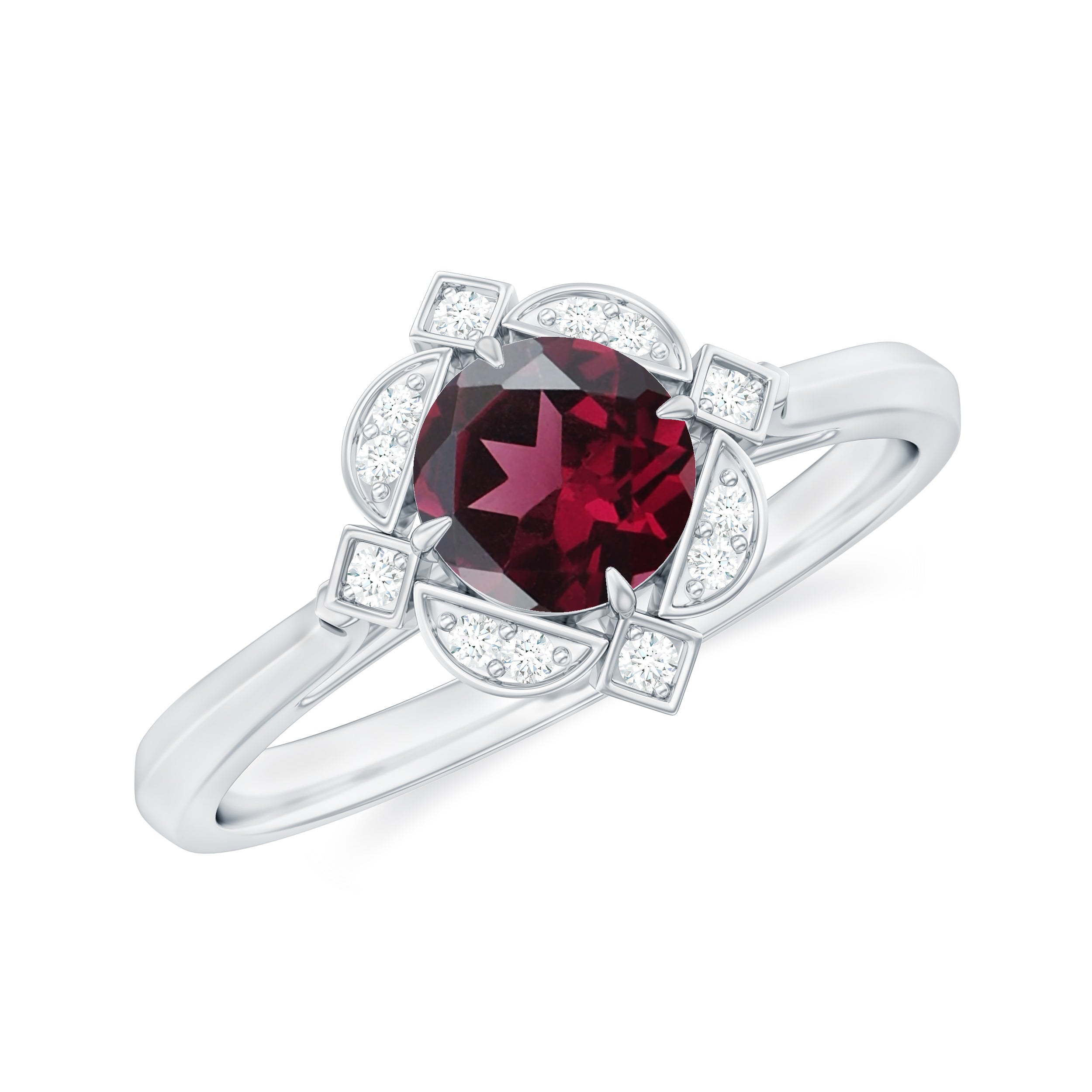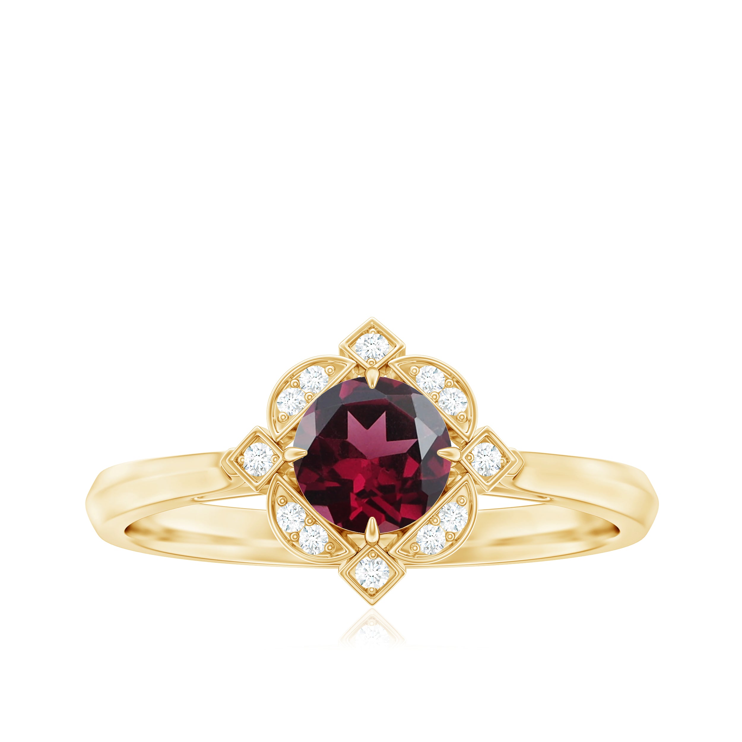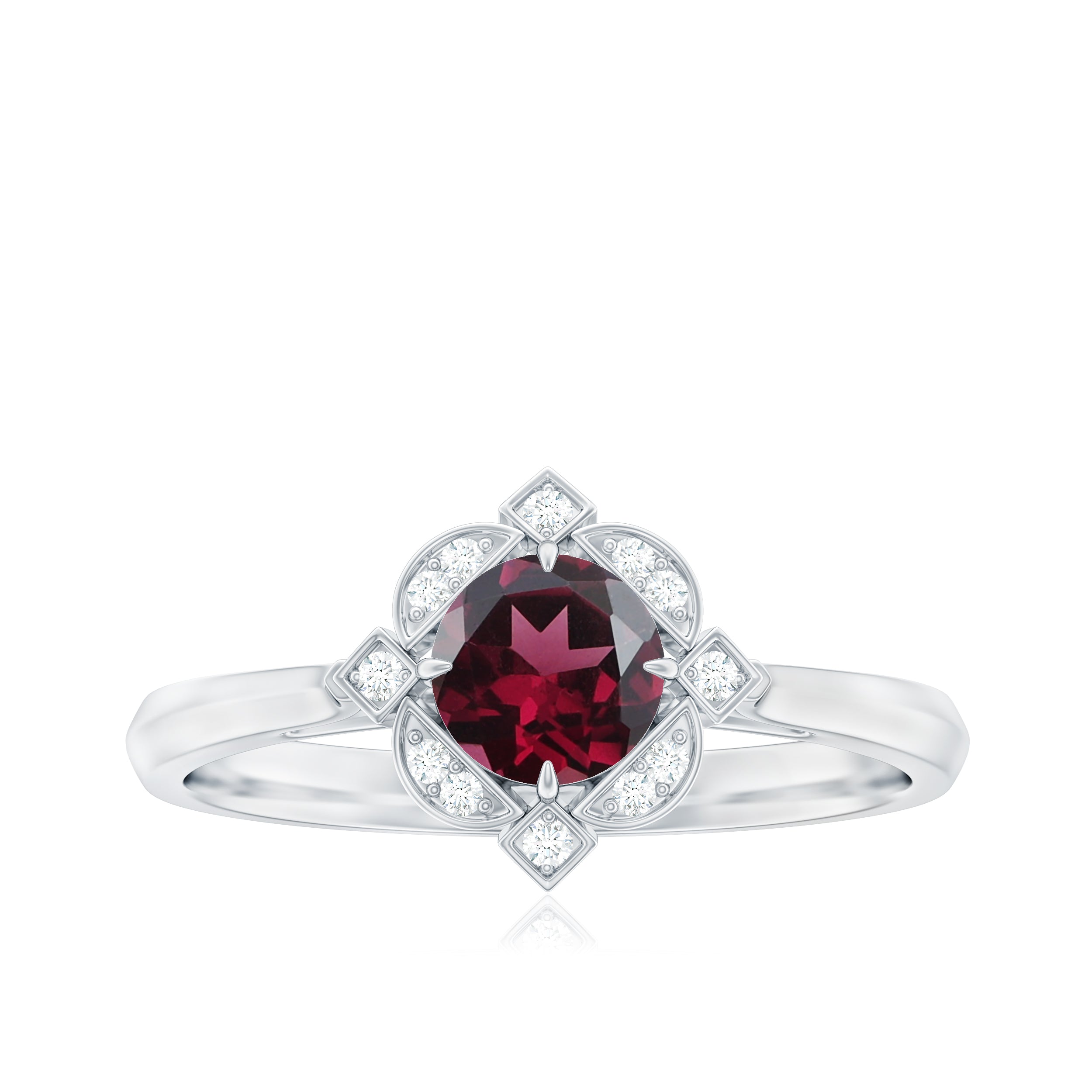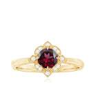 Make a statement with this vintage-inspired engagement ring, featuring a 5 MM Round Shape Rhodolite center, highlighted by Diamond-accented in engraved patterns.