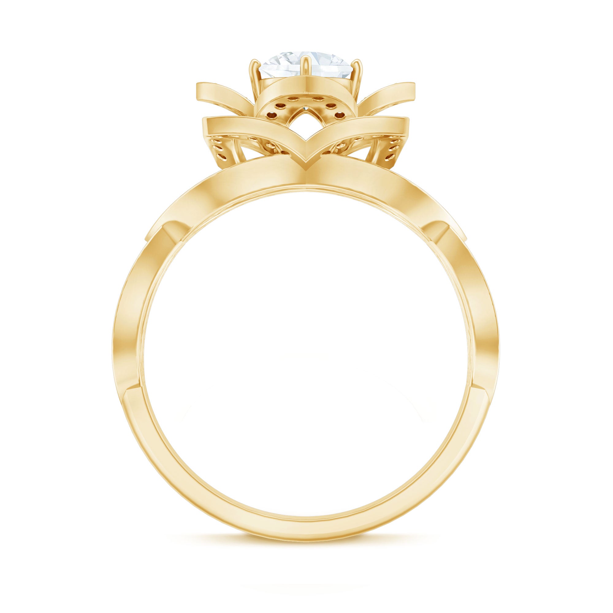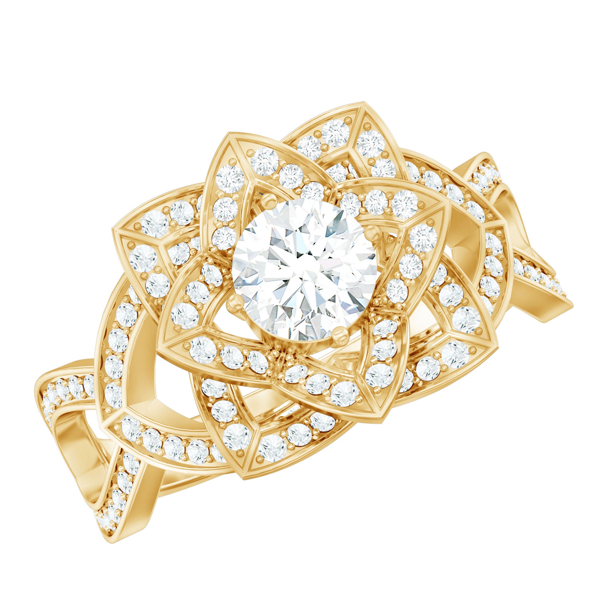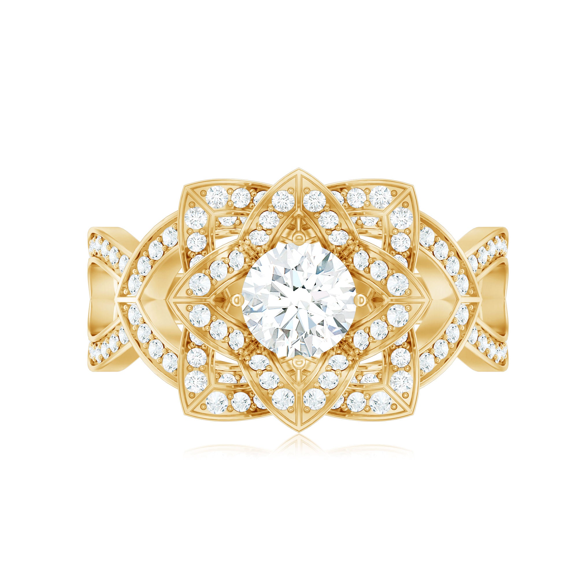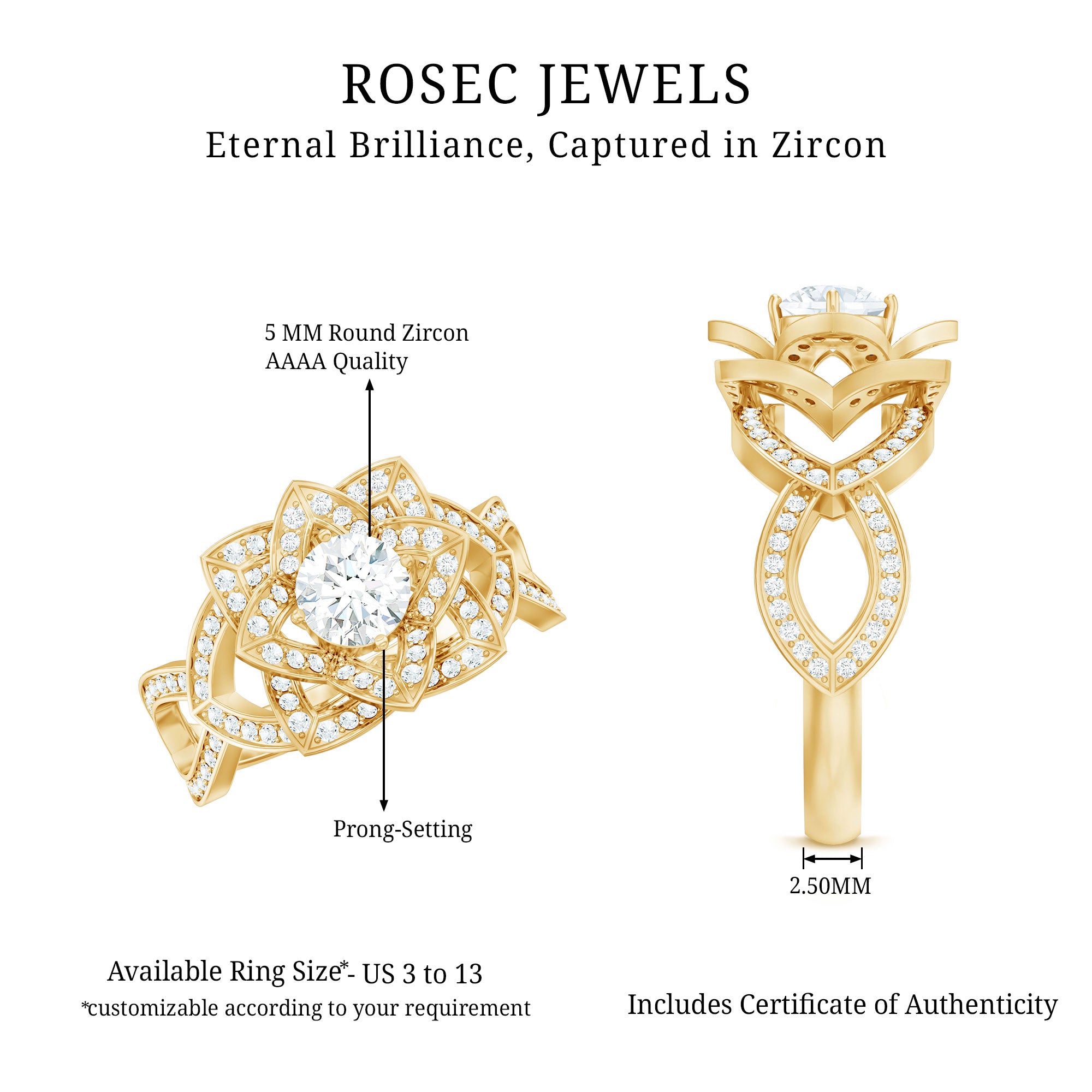 This classic and phenomenal Zircon Gold Ring is adorned with a solitaire round-shaped Zircon set in the center, with round-shaped Zircons arranged around it like flower petals, creating a stunning lotus flower design. The vintage engagement ring is crafted from gold, making it even more special. Present this breathtaking flower ring as an anniversary or wedding present and leave her breathless with its beauty.