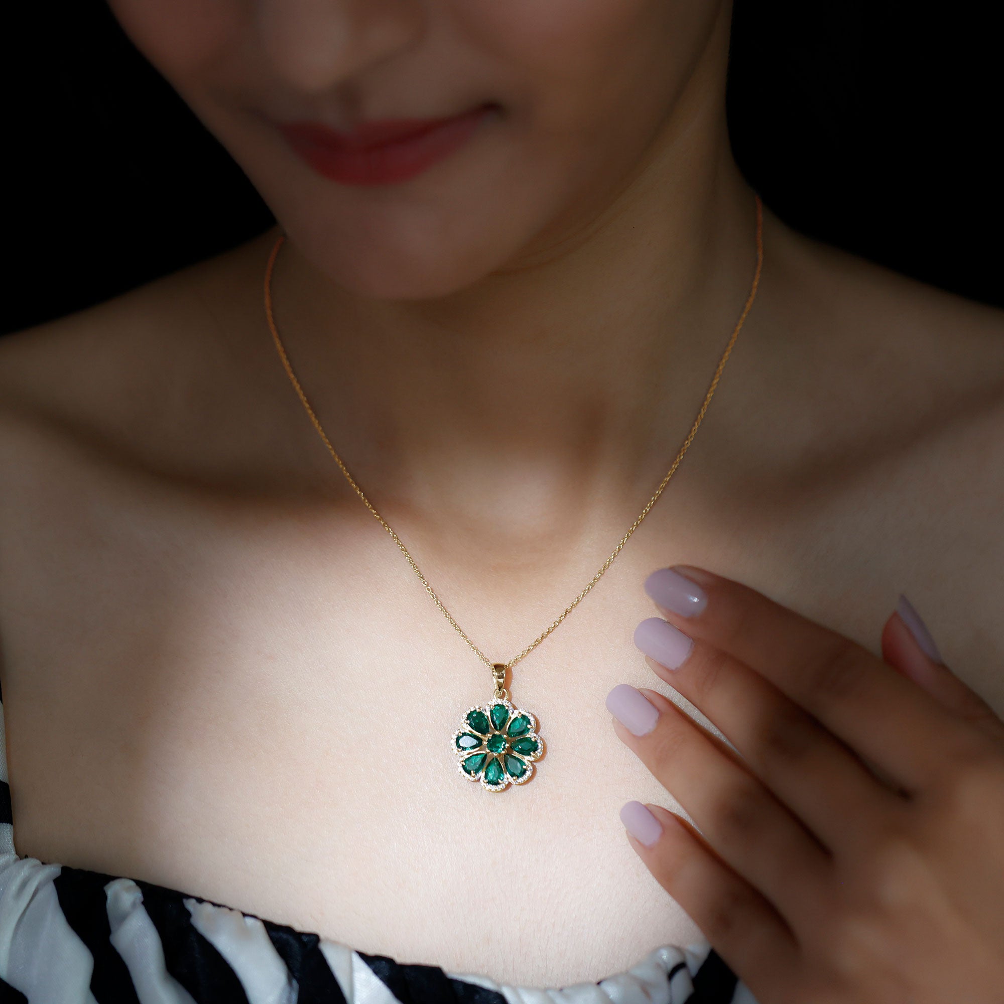 A whisper of nature’s beauty brought to life, this Lab Created Emerald Flower Necklace captures the enchantment of a blooming garden wrapped in fine jewelry artistry. At its heart lies a brilliant round lab created emerald, surrounded by pear cut emeralds that unfold like delicate petals. Completing the design, a halo of dainty round moissanite stones adds a radiant sparkle, enhancing the pendant’s shape with a soft brilliance. Crafted with precision and intention, this Emerald Pendant Necklace is as meaningful as it is beautiful. Every gemstone is ethically lab created, offering an eco-friendly alternative without compromising on quality or elegance. The harmonious blend of AAAA quality lab made emeralds and D-VS1 quality moissanite creates a piece that stands out effortlessly, perfect for elevating both everyday wear and special occasions. Suspended from a sleek chain, this Floral Pendant Necklace rests gracefully along the neckline, adding a touch of sophistication and a hint of vibrant color to any ensemble.