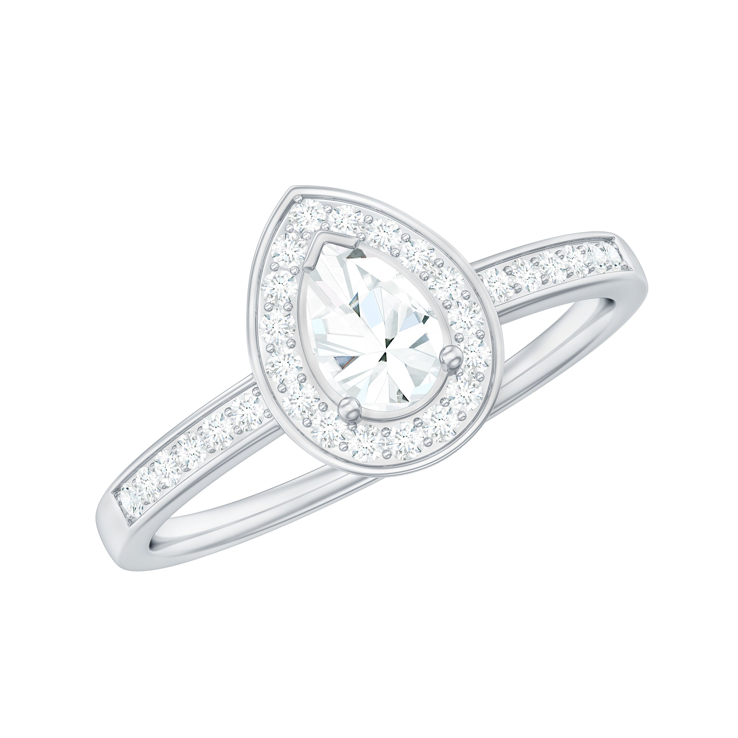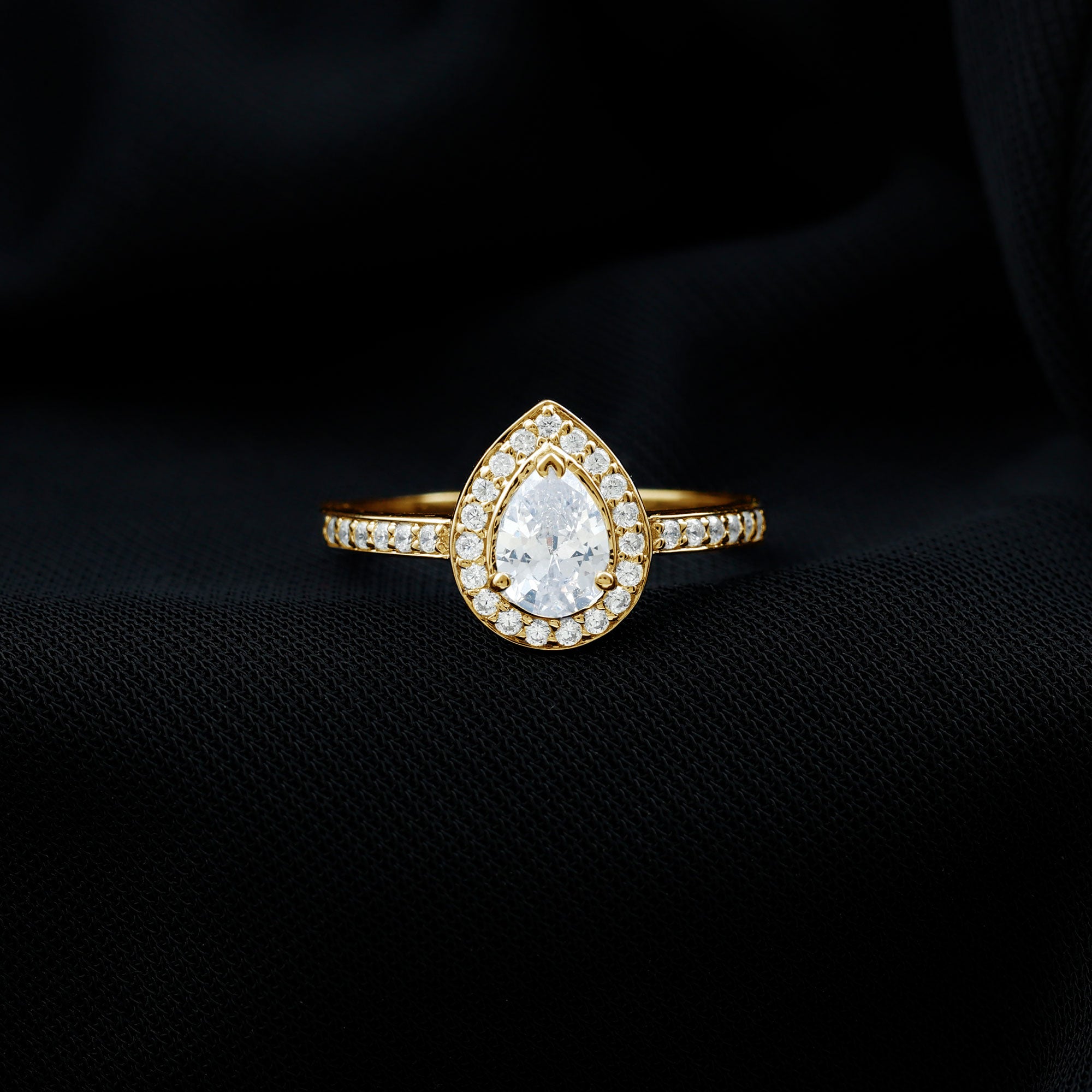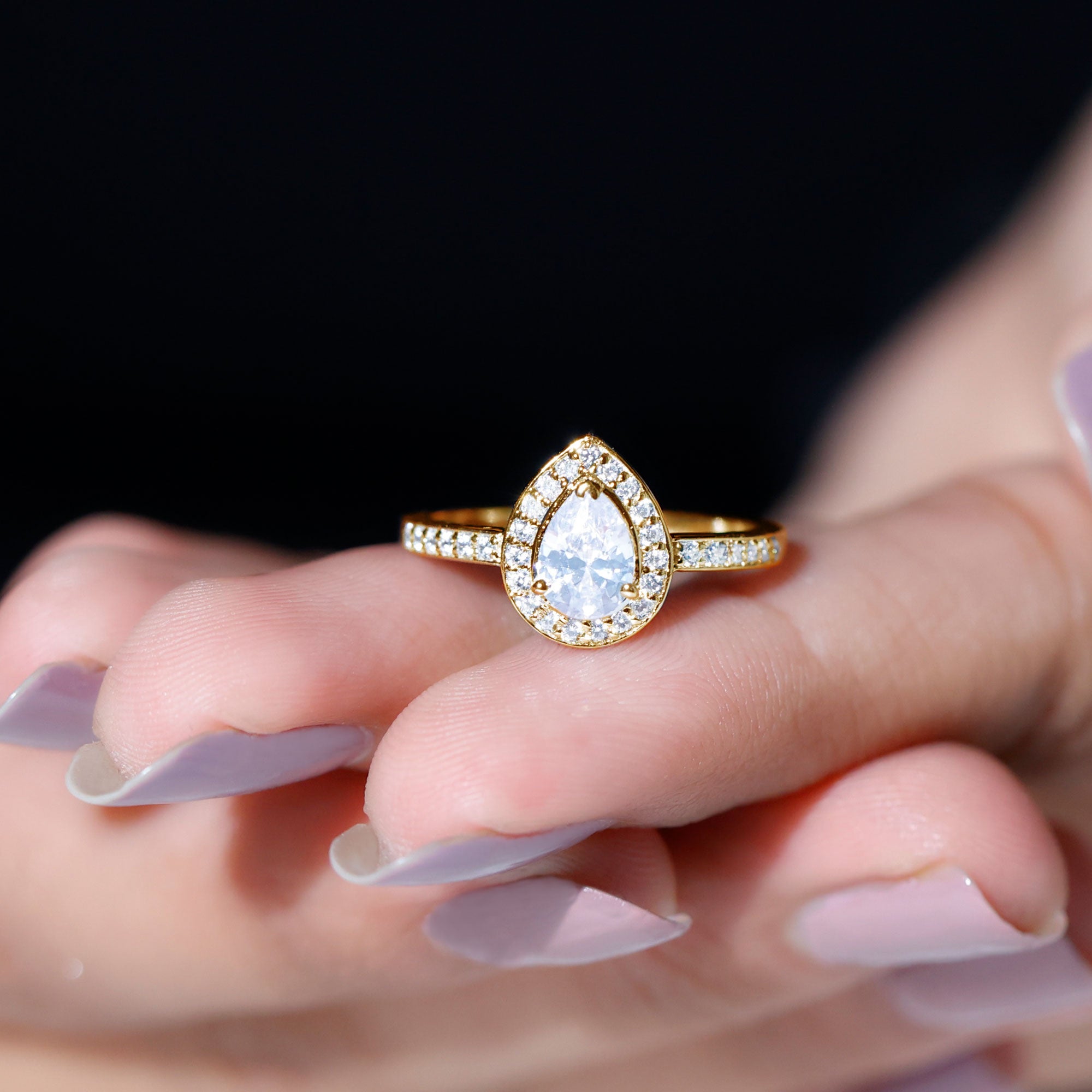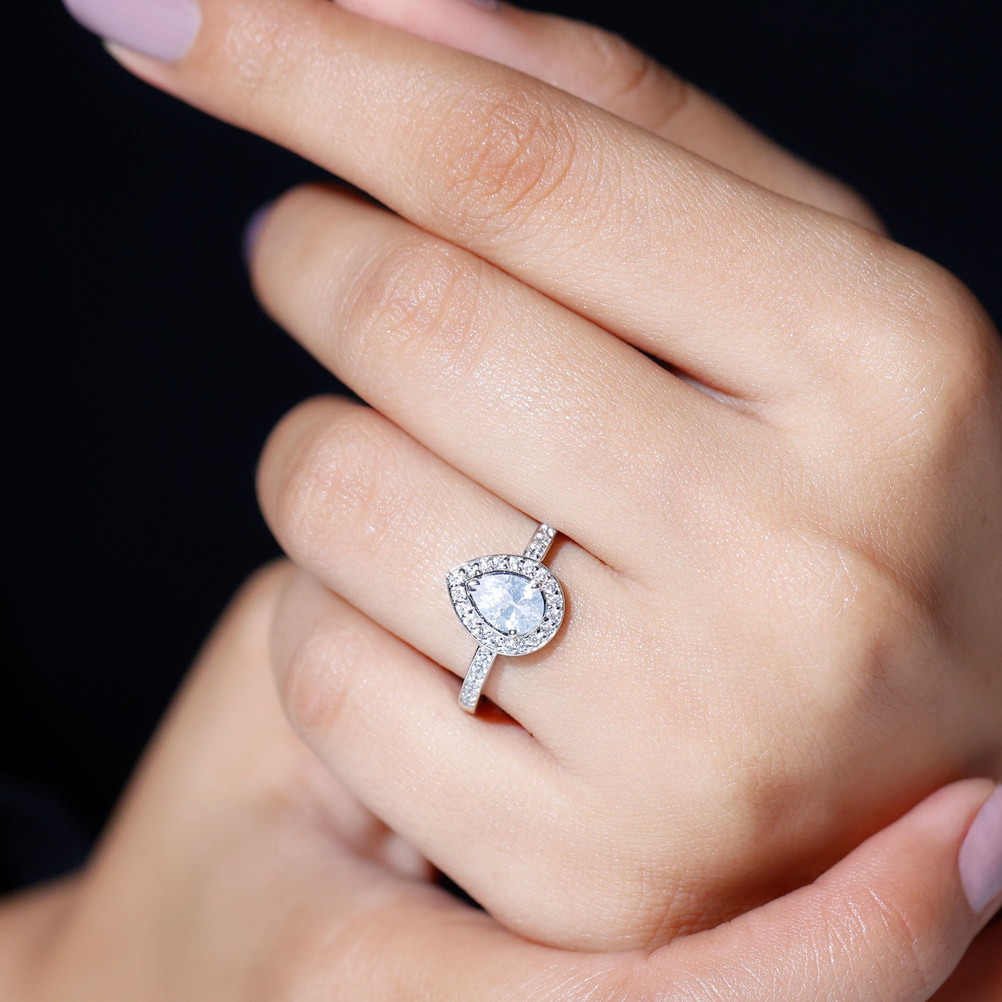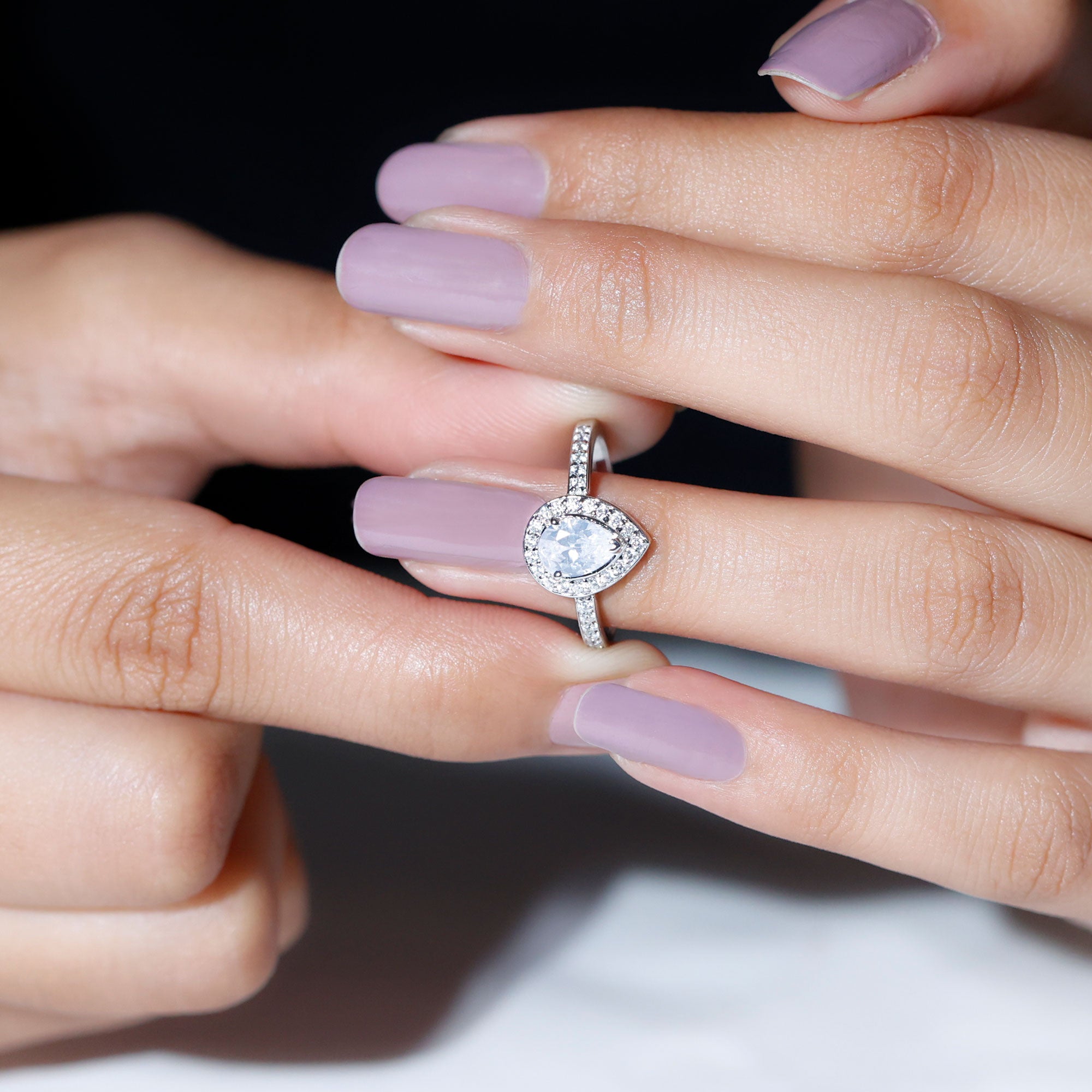 Get this alluring Zircon Engagement Ring adorned with Pear Cut Zircon in Prong Setting and more dainty Round Cut Zircons studded as Halo and on the shank. • The Zircon Ring will make her look elegant when paired with special attires. Declare your feelings for your partner by getting this Halo Ring and she will find reasons to wear it again and again.