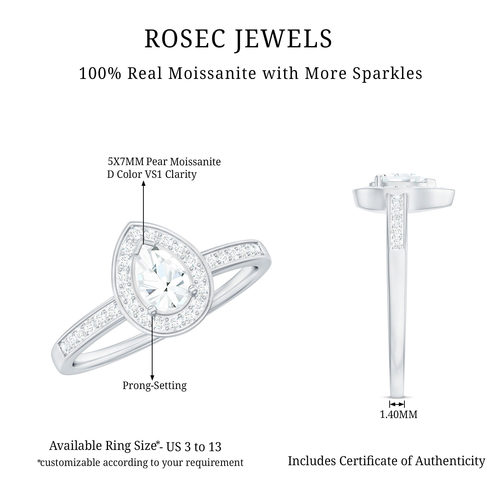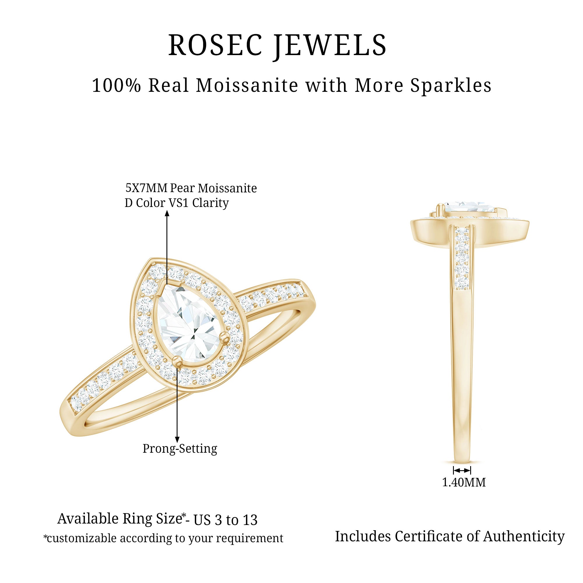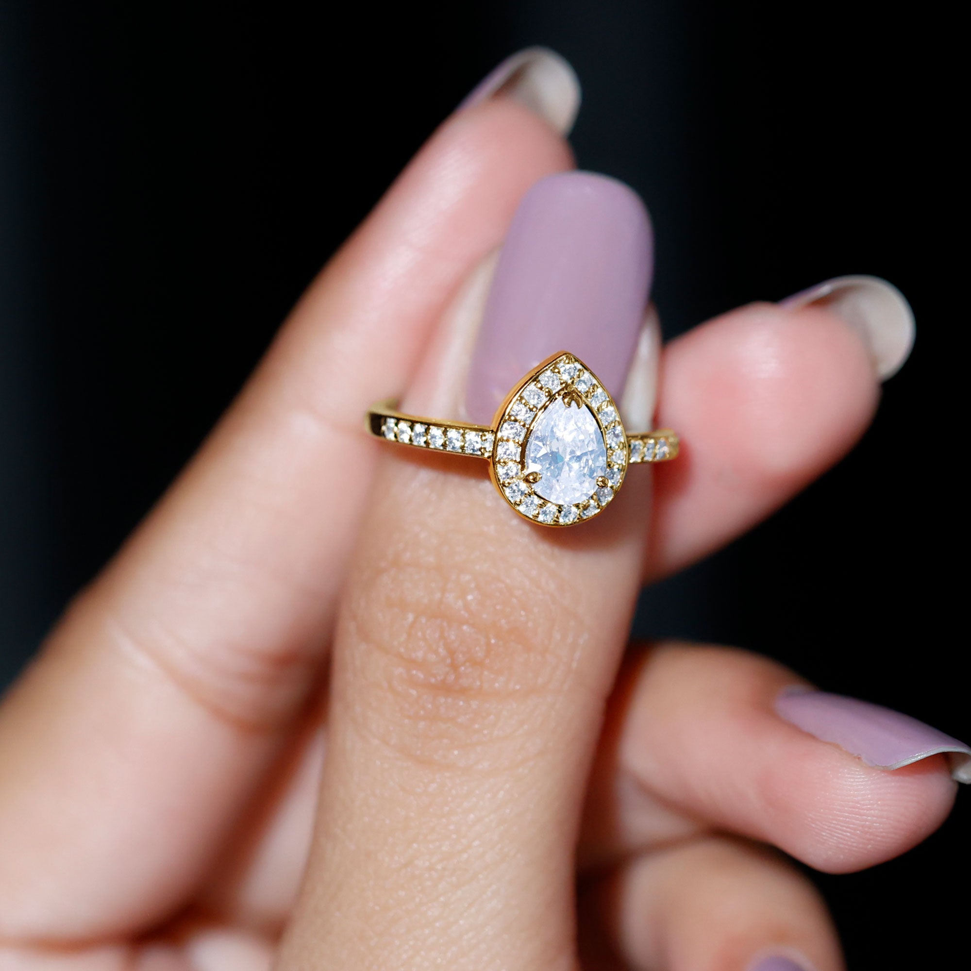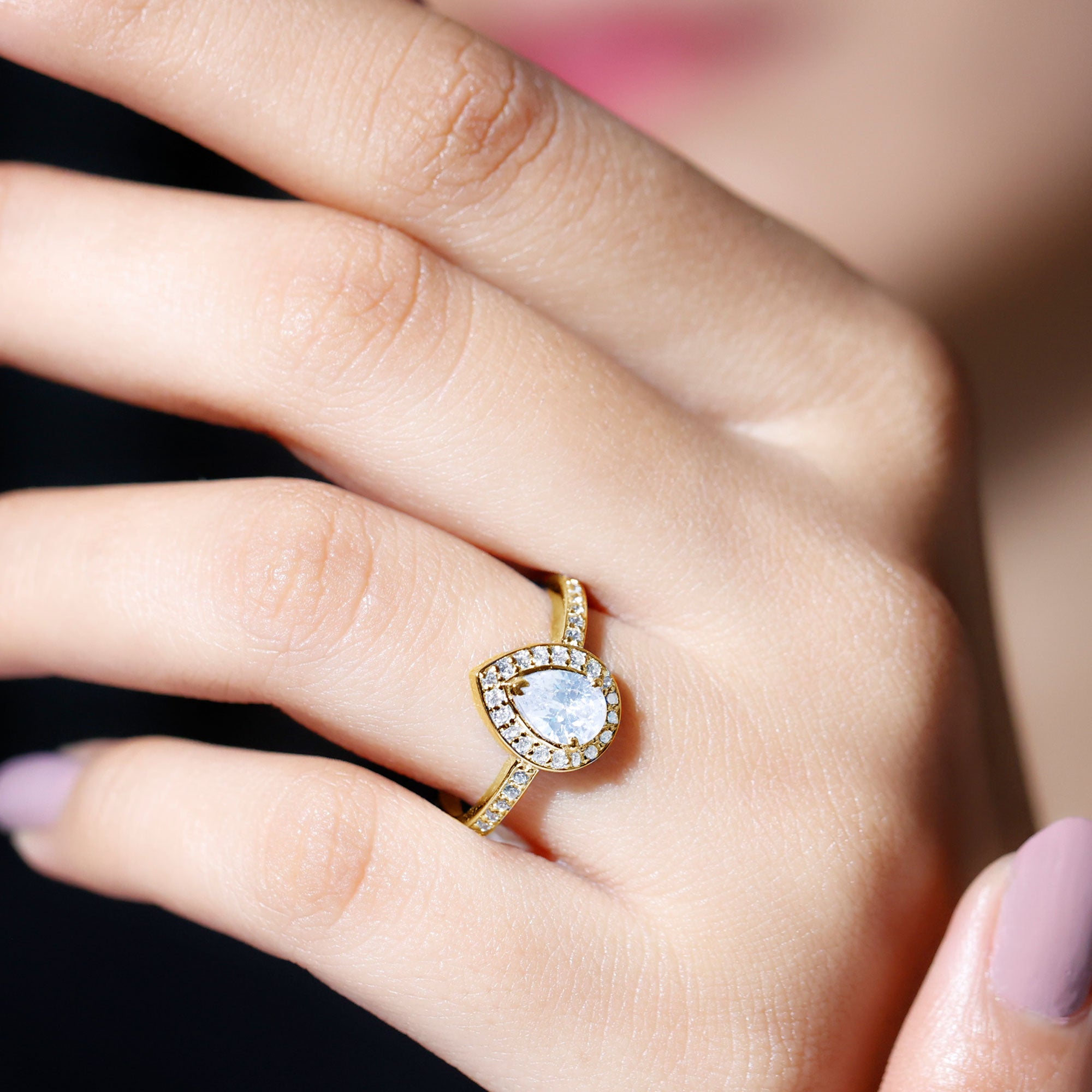 Get this alluring Zircon Engagement Ring adorned with Pear Cut Zircon in Prong Setting and more dainty Round Cut Zircons studded as Halo and on the shank. • The Zircon Ring will make her look elegant when paired with special attires. Declare your feelings for your partner by getting this Halo Ring and she will find reasons to wear it again and again.
